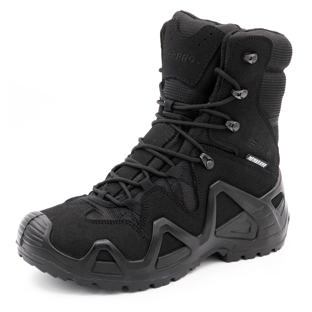 Серия обуви E-PRO — это одна из самых популярных в туристической и тактической обуви, используемая походниками, альпинистами, спортсменами, военными и сотрудниками правоохранительных органов. Линейка E-PRO Special представлена целым семейством моделей, отличающихся по цвету, высотой берца, а также наличием мембраны. Основной материал изготовления — высококачественная замша со вставками из кордуры. Наличие подкладки из мембраны делает обувь непромокаемой и одновременно дышащей, способной отводить испарения с поверхности стопы. Подлитой носок обеспечивает защиту от повреждений. Защитный рант с выборками для облегчения веса проходит по всему периметру и создает узнаваемый образ. Кроме основных функций рант дает дополнительное сцепление с поверхностью, например, при движении вдоль склона. Высота среднего ботинка 14.5 см, этого хватает для отличной фиксации голеностопа. Все детали прошиты двойным швом, все швы сделаны крайне аккуратно. На пятке есть петелька, облегчающая надевание.